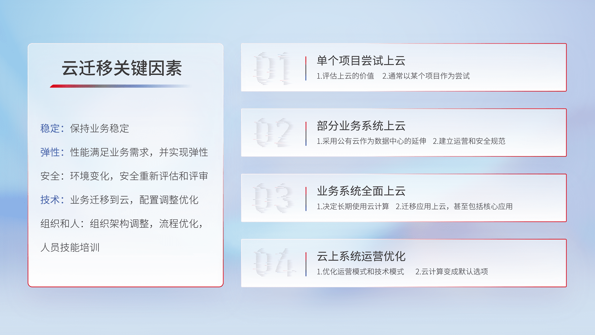 结合实际业务,,,从规划设计、、、云平台选型、、、云原生改造、、、、数据迁移、、、、集成交付,,迁移全过程为客户识别最佳上云路径,,,做好风险识别管理,,,设计网络架构、、、、身份权限、、安全审计合规、、操作审计、、、日志审计、、监控告警策略、、多站点容灾设计等,,,,对云上基础设施进行整体规划,,提升IT治理水平,,以满足弹性、、高可用、、高性能的需求。。。。