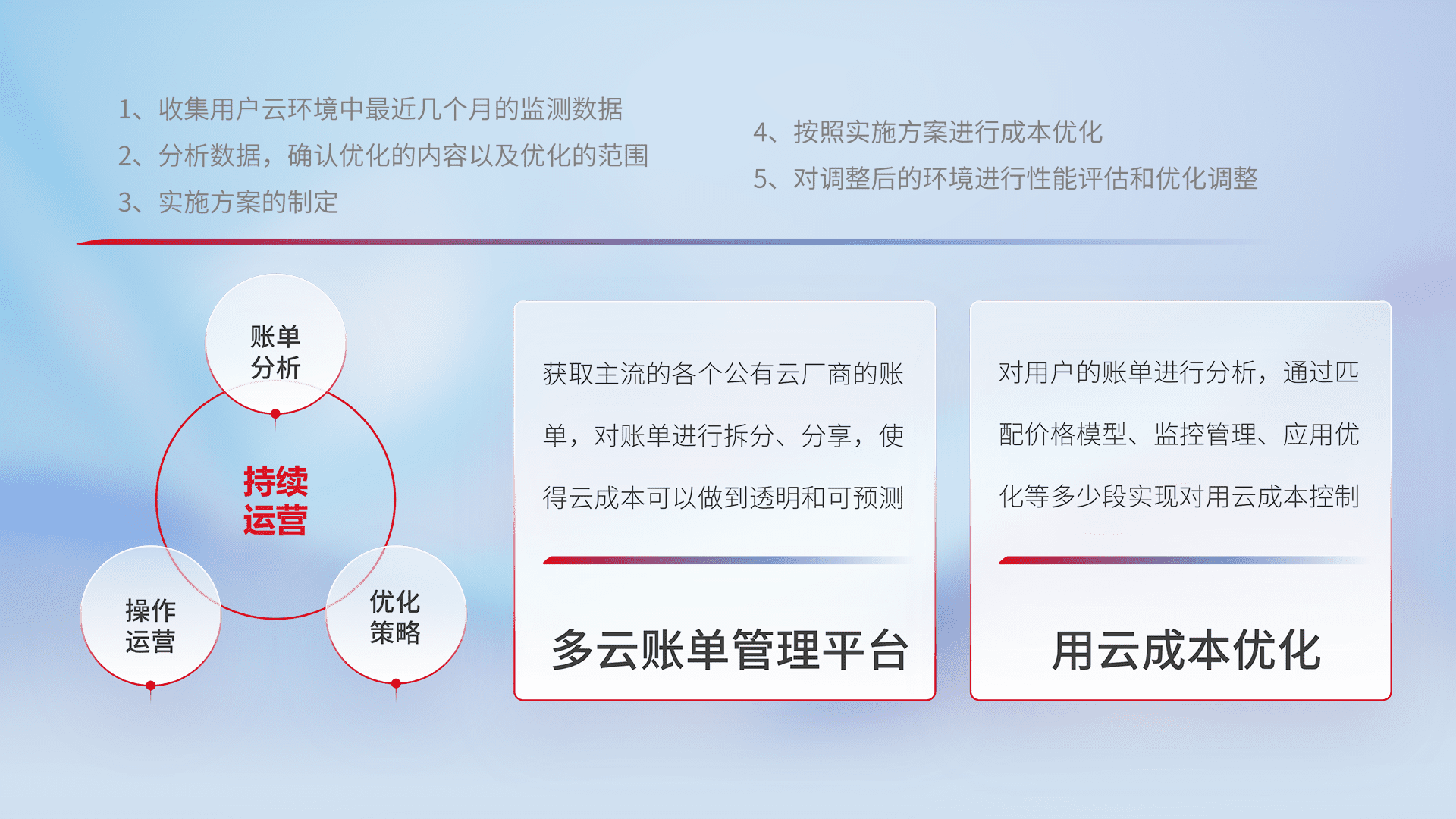 通过多云纳管,,以统一的资源数据模型把客户的云资源进行抽象和封装,,,,进而实现对多云资源的统一操作,,保障云资源管理的可靠性、、、、稳定性与可用性。。量身定制化运维内容,,,,配置、、、开发运维、、补丁管理、、、、备份、、监控、、、认证和访问管理、、审计和日常巡检等,,,保障在用云过程中的可靠度,,,,稳定度以及高可用率。。